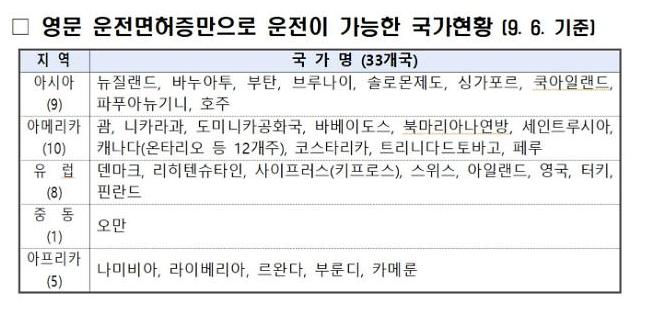 현재 운전 가능한 국가는 위와 같이 33개국이 가능하다. 이 외에도 미국에도 적용시키기 위해 대기 중에 있다.