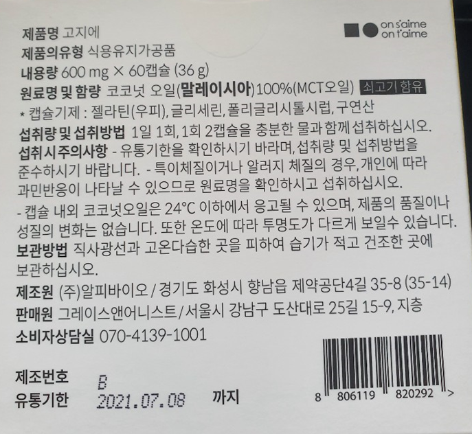 기본 베이스가 코코넛 오일(말레이시아) 100%(MCT 오일) 쇠고기 함유라고 하네요.