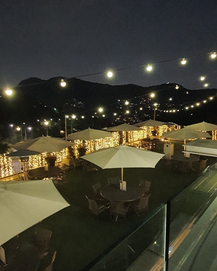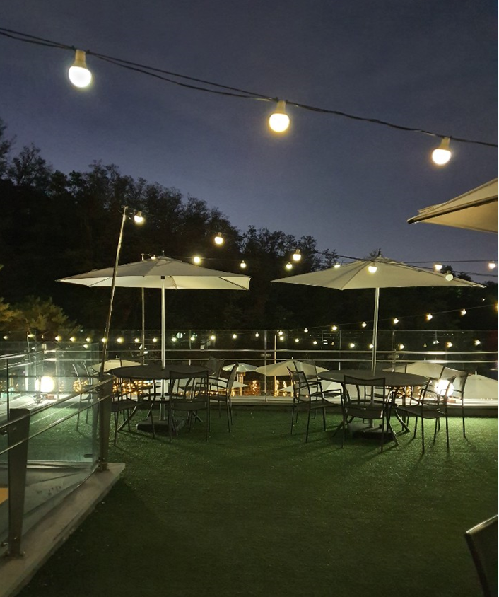 열심히 드시다가 배가 좀 불러서 소화를 시키고 싶으신 분은 위층에 올라가셔서 예식장 할 수 있는 곳과 다이닝 및 카페를 즐길 수 있는 곳이 있는데요. 테이블도 많이 있고 잔디로 구성되어있어 밖에서 야경 및 풍경을 볼 때는 참 좋은 거 같습니다.