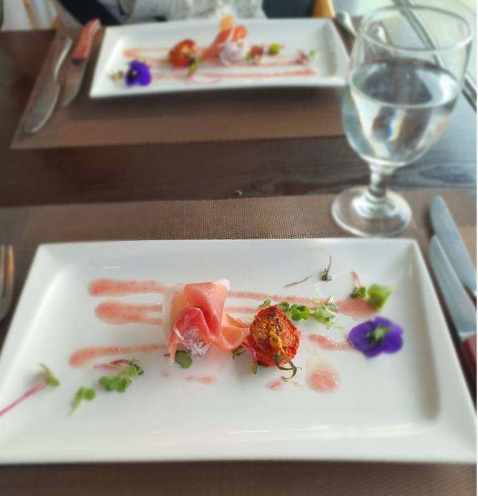 이번 음식은 하몽에 구운 토마토인데 하몽 밑에 까망베르 치즈 인지 적절하게 맛있는 치즈가 같이 있어 소스와 함께 아우러진 맛이 너무 맛있습니다. 먹을 수 있는 식용꽃 도 오랜만에 먹어보는 거 같은데요. 식용꽃은 보거나 먹은 게 좀 오래된 것 같습니다. 음식의 색감도 빨간색이어서 식욕을 자극하고 있는데 보라색으로 눈의 즐거움까지 겸비해서 2번의 효과를 주고 있는 거 같아 기분이 좋네요.