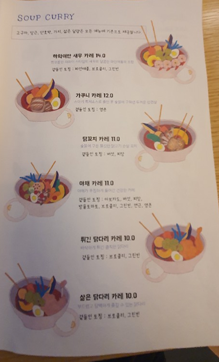 진짜 오랜만에 홍대를 방문한 거 같습니다. 데이트하러 홍대 가는 일이 별로 없는데 오늘은 우연치 않게 홍대를 방문하게 되었네요. 오늘은 이곳저곳 많이 둘러보다 그중에서 제일 가까우면서도 인스타에 인기 많은 곳을 찾아보니 카레 음식점이 하나 눈에 들어와서 수프 카레 집으로 향했습니다. 처음에 입구가 몹시 좁고 2층에 위치하여 간판을 잘 보시면서 들어가시는 것을 추천드립니다. 잘 못하다 다른 식당으로 들어갈 수 있는 불 쌍사가 발생할 수 있습니다. 딱 들어가면 깔끔한 인테리어로 구성되어 있고요. 원하시는 곳에 앉아 있으면 메뉴판과 물을 세팅해 주기 때문에 열심히 메뉴판을 정독하시면 됩니다.