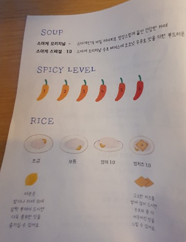 메뉴를 고르신 다음에 카레의 맵기와 함께 밥량을 선택하셔야 되는데요. 맵기는 3을 선택했는데 한국인 평범한 사람을 기준으로 하나도 맵지 않습니다. 매운맛을 느끼고 싶으시다면 제일 높은 것을 드셔도 무방한 듯합니다. 추가적으로 밥양은 보통을 선택하였는데요. 딱 적당한 양이라고 생각하는데 치스 밥은 좀 무슨 느낌인지 궁금하긴 합니다.