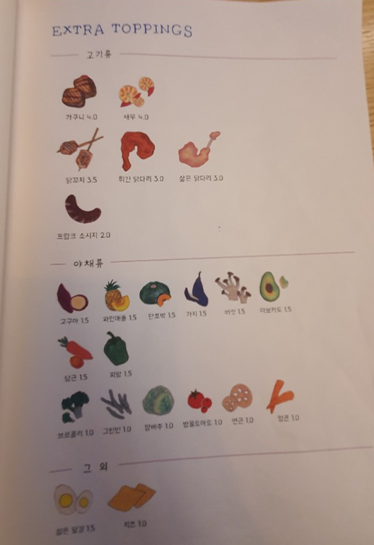 추가로 토핑을 추가하실 수 있는데요. 제가 새우를 골라서 가쿠니가 없기 때문에 가쿠니만 추가 하여 먹었는데 역시 고기는 고기입니다. 장난이 없죠. 소시지랑 닭다리도 넣어 먹어 드시는 분이 많이 있던데 다음에는 그렇게 넣어 보려고요. 전체적으로 하나씩 넣으면 좋지만 그럼 배보다 배꼽이 더 큰 격이라 많이 슬퍼질 거 같아서 참아보도록 하겠습니다. 카레와 잘 어울리는 재료들이 잘 선별되어 있어 아주 좋은 시스템으로 구성되어 있습니다.