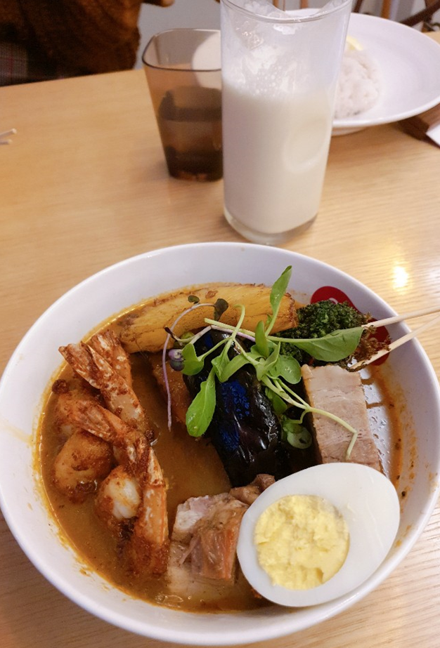 메인 메뉴 카레인데요. 그림으로 표현된 것과 같은 친구들이 열심히 보이고 있습니다. 제가 선택한 카레는 맨 위 모든지 제일 위에있는게 메인 이기 때문에 처음 가는 식당은 1번을 추천드립니다. 하와이안 새우 카레로 튀긴 새우가 몹시 맛있습니다. 여자 친구는 가루니 카레를 시켰는데요. 두툼한 살집이 느껴지는 돼지고 가 2점이 들어가 있습니다.