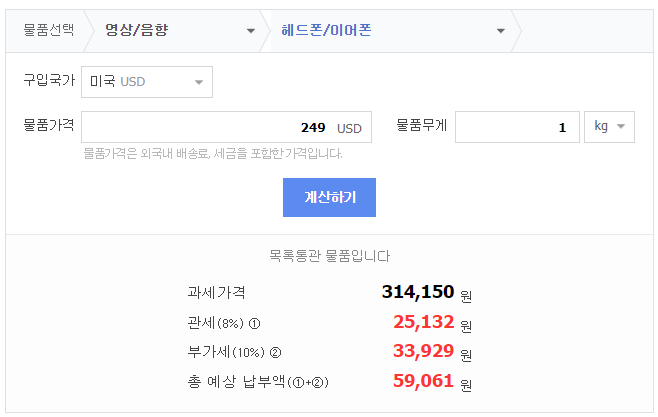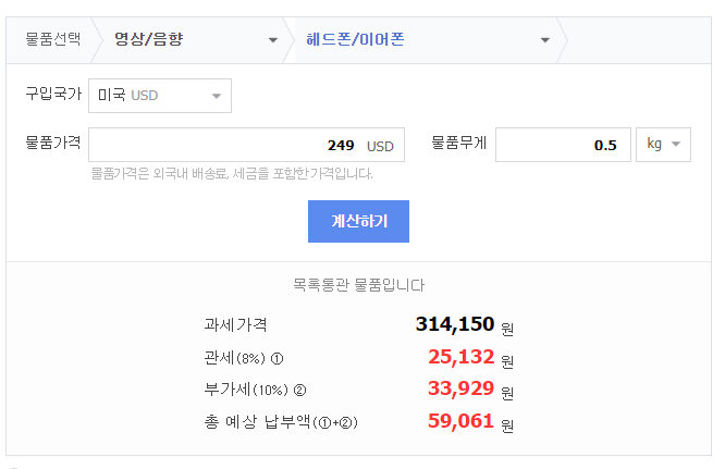 택배의 경우 무게별로 가격을 측정하는데요. 에어 팟 프로의 경우 무게 및 LBS 측 부피가 그렇게 크지 않기 때문에 가격이 그렇게 크게 측정되지는 않습니다. 다만 $200불이 넘는 가격이기 때문에 관세비용이 추가로 적용 될 수 있어 이부분을 참고 하셔야 됩니다. 에어팟 프로 기준 네이버 관세 계산기를 통해 측적하여 보았을 때 대략 납부 금액은 6만 원 선입니다.