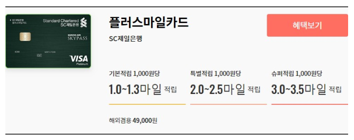 라운지 이용을 많이 할 수 있는 카드를 찾아보던 중 연회비 대비 괜찮은 카드를 발견했는데요. 바로 'SC제일은행'에서 진행하는 SC 플러스 마일 카드입니다. 이와 비슷한 카드를 예를 들면 아시아나 1.0 대한항공 1.5인가 이런 친구들이 존재하는 신한은행 베이스 카드와 비슷합니다. 다만 이 친구는 라운지 키 기능이 존재하여 국내뿐만 아니라 해외에서도 대기 시간이 많으면 공항 라운지를 즐기며 쉬다 올 수 있습니다.
