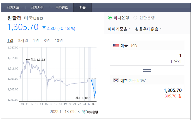 네이버 환율기준 (2022.12.13일 09:28) 달러가 많이 내려가고 있는 추세로 지금 미리 달러를 환전해 두는 것도 나쁘지 않은 방법 입니다.
