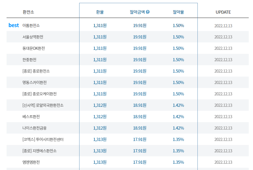 아래 사이트는 당일 기준 제일 저렴하게 환전가능한 환전소 리스트를 보여주는 사이트 이오니 참고하셔도 좋을거 같습니다.