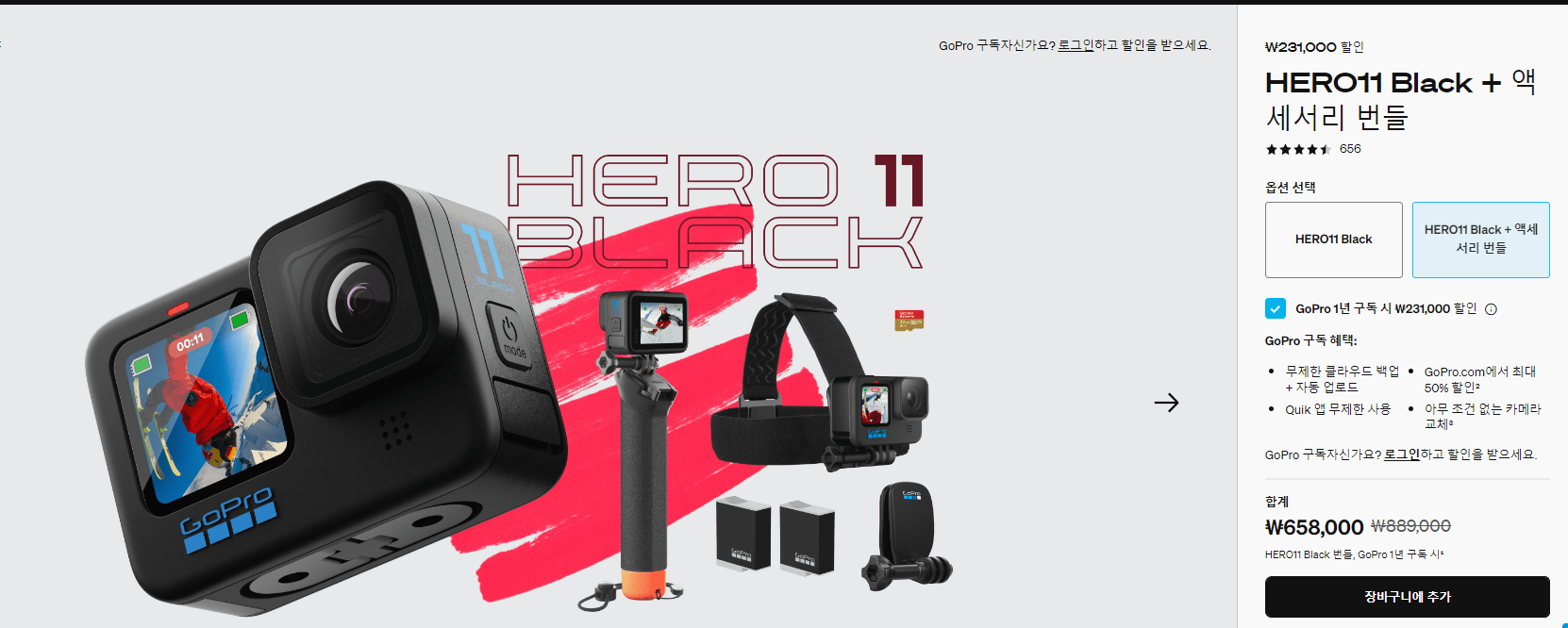 여기서 제가 구매한 상품은 아래 고프로 히어로 11 black + 액세서리 번들 패키지 상품인데