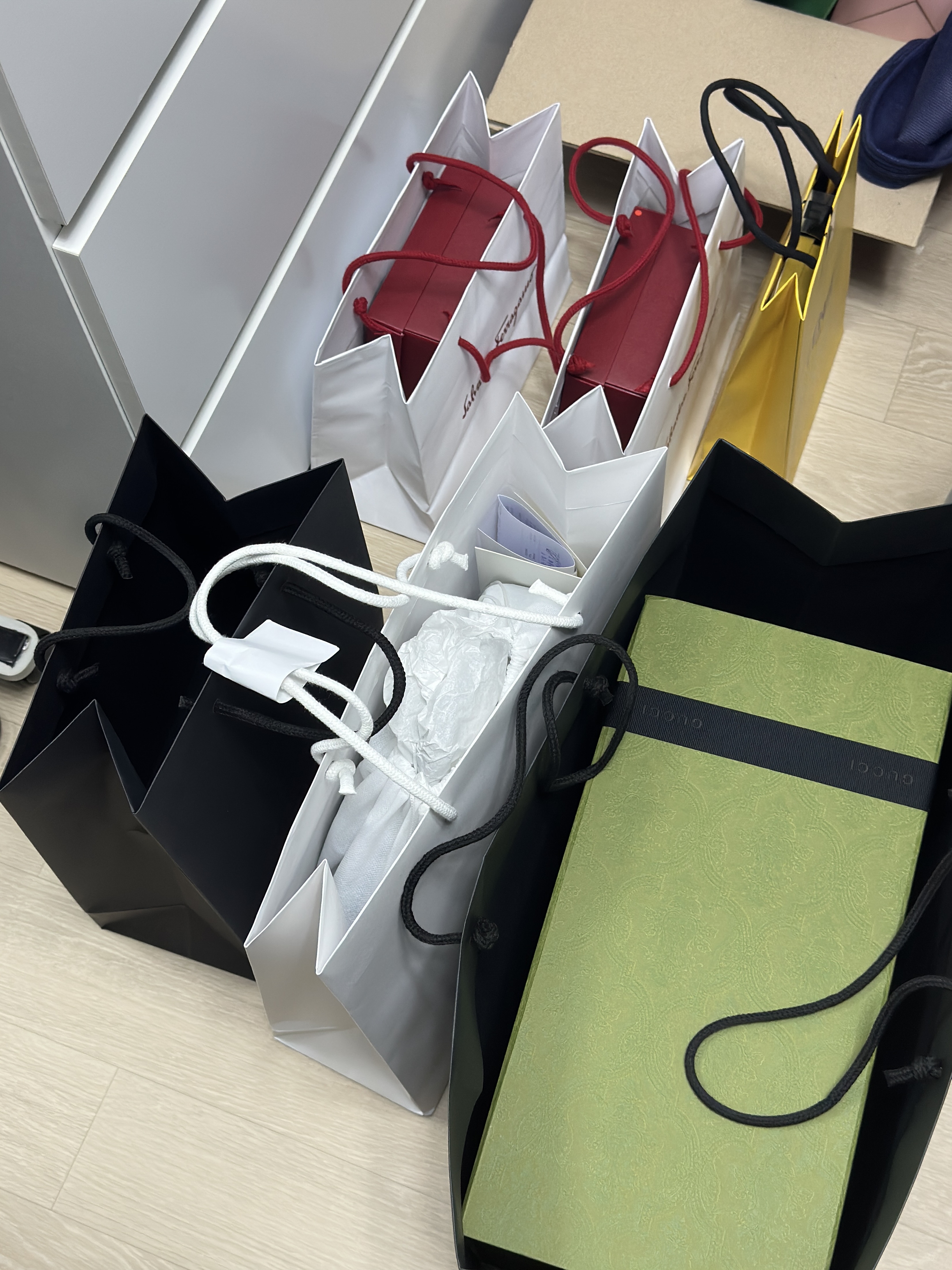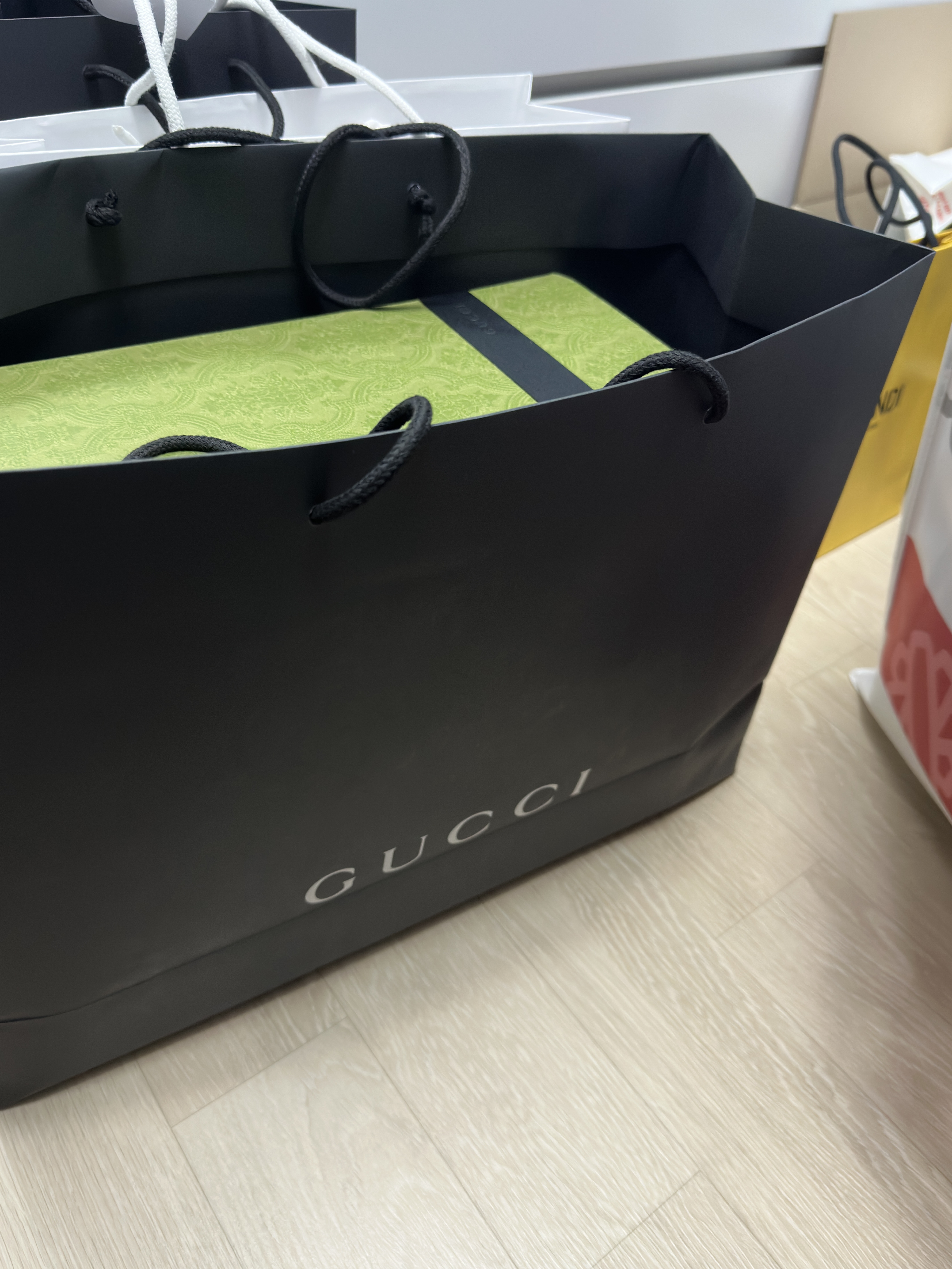2) 구찌 : 핸드백 기준 150만원 ~ 260만원 정도로 종류도 다양하고 선택이 폭이 좀 더 많아서 손님이 구찌쪽에 좀 더 많더라구요. 구찌는 일단 포장이 너무 이뻐서 선물해드리거나 받는사람 모두 만족할 거 같더라구요. (BOX 포장 해달라고 해달라고 하면 초록색 박스에 이쁘게 넣어 줍니다.)