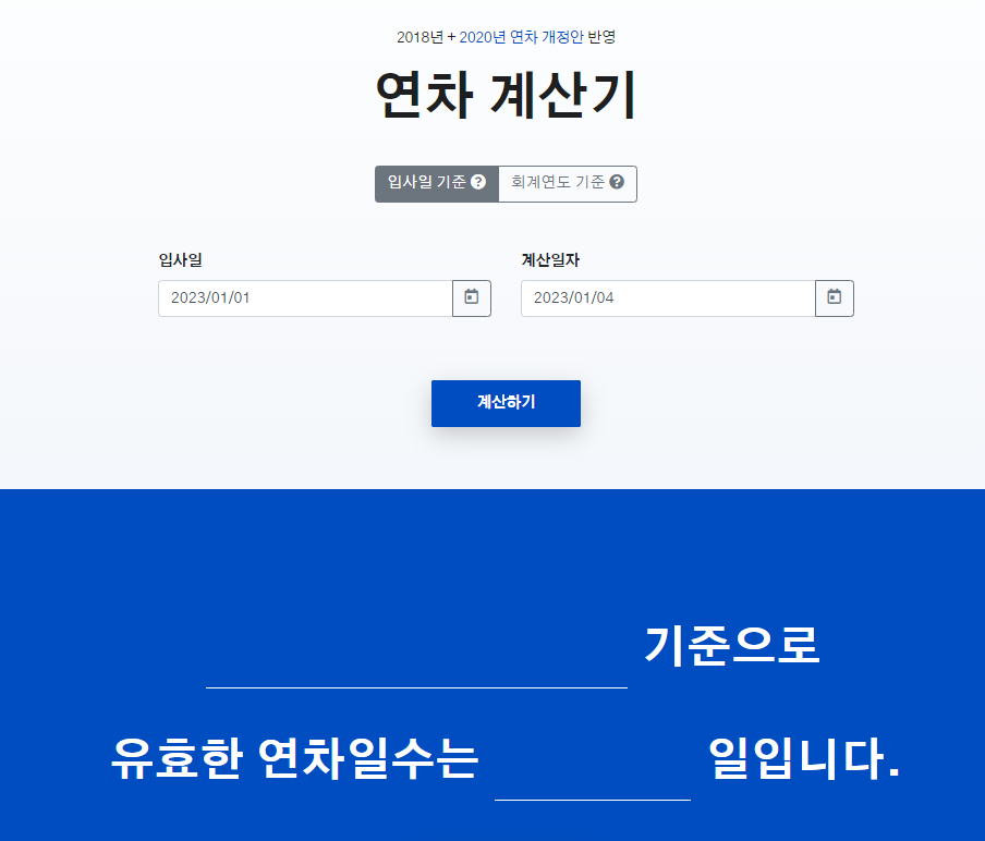 위에 이미지를 보시면 입사일과 현재일을 각각 선택하여 주시고 중앙에 파란버튼인 계산하기를 눌어주게 되면