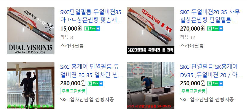 듀얼비전 35는 단열 필름 및 시선차단 기능이 있는 강화된 필름으로 신축 아파트에 주로 많이 사용하시는 느낌이 들더라고요. 필름 중에서 시공 후기가 가장 많았던 제품으로 중간정도의 가격으로 외부 시선이 완벽하게 차단되지는 않지만 많이들 사용하고 있는 제품 같습니다.