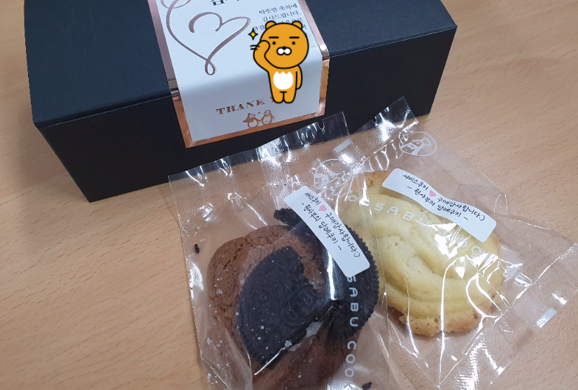 보통 보편 적으로 하는 떡이랑 수건들도 같이 찾아봤는데 그래도 느낌있게 수제쿠키가 포장도 깔끔하고 간편하게 먹을 수 있을 거 같다는 우리 부부의 선택이었는데 요즘에 젊은 사람들도 쿠키를 많이 하는 추세인 거 같았어요.