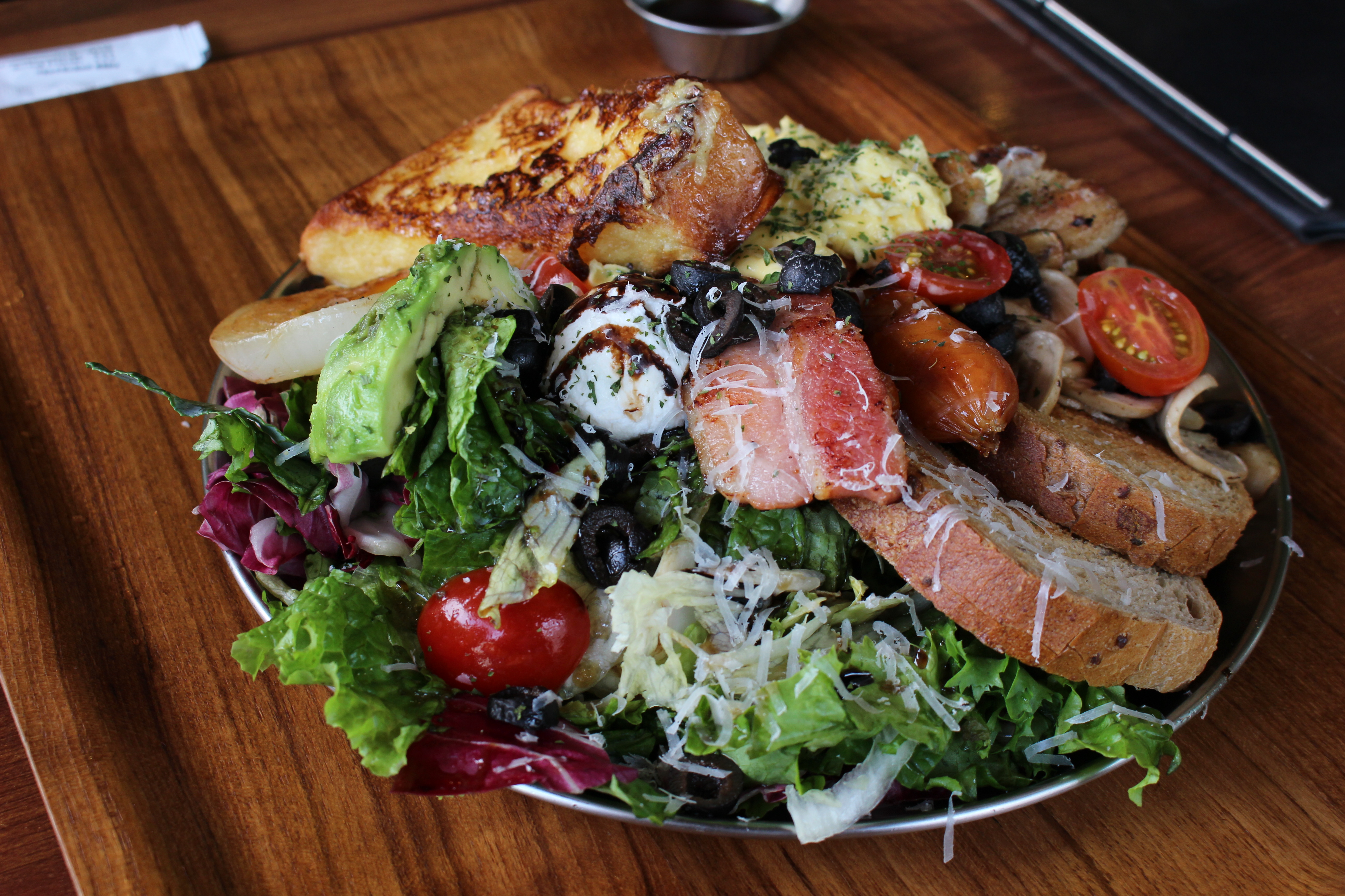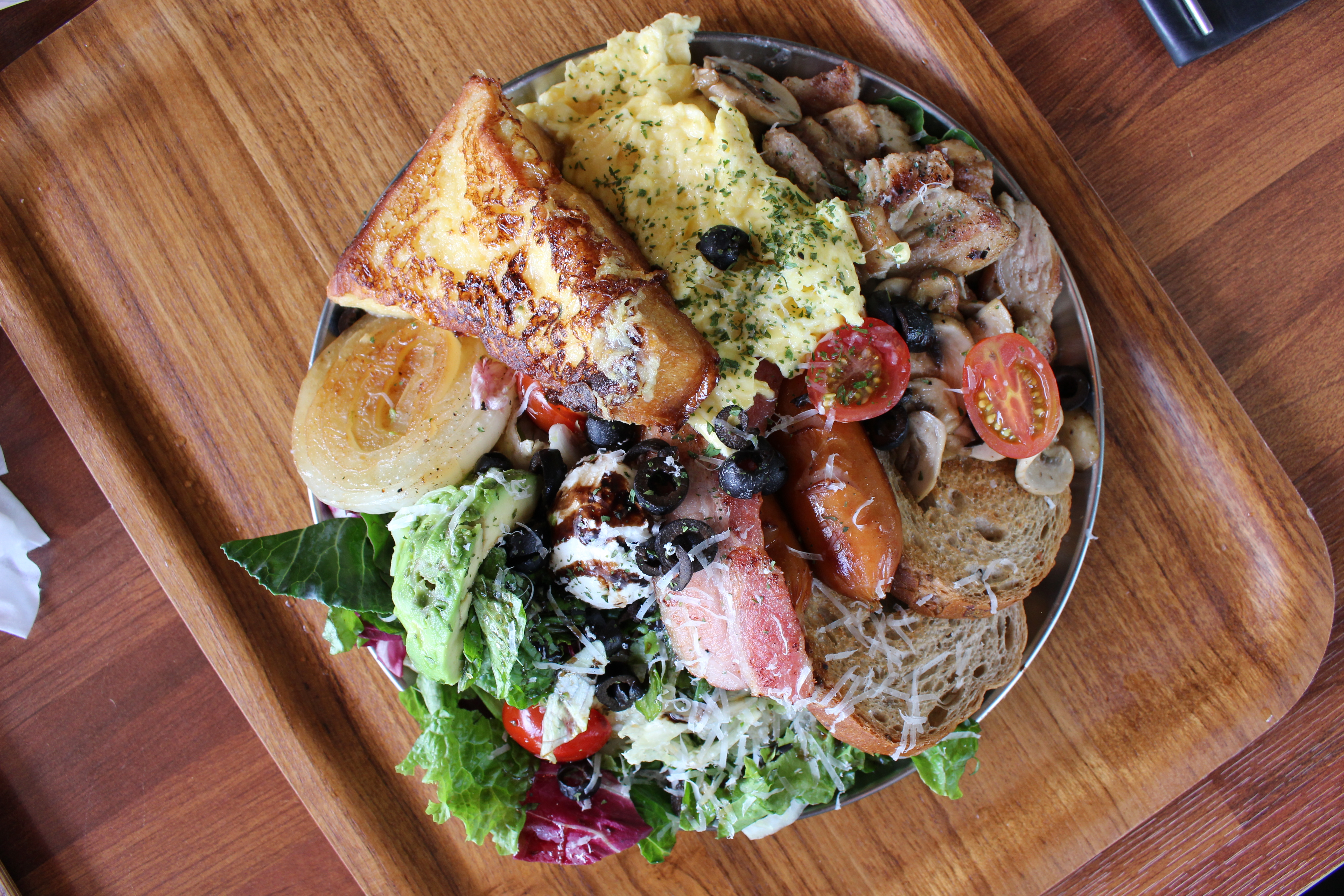 토스트, 스크럼블, 고기, 양파, 아보카도, 풀때기, 베이컨, 빵, 방울토마토, 해쉬브라운, 치즈, 버섯