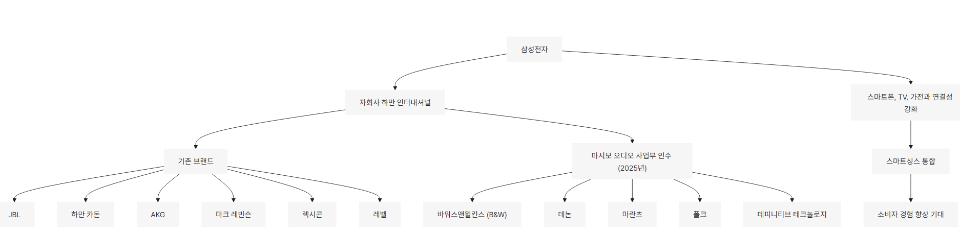 2025년 5월 7일(현지시간 5월 6일), 삼성전자의 자회사 하만이 미국 마시모의 오디오 사업부를 3억 5천만 달러(약 5천억 원)에 인수하는 계약을 체결하며 보유 브랜드가 더욱 확장되었습니다. 이는 2017년 하만 인수에 이어 8년 만의 대규모 인수합병입니다.
