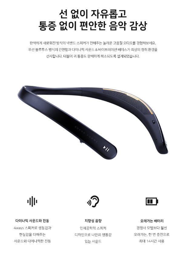 스피커인데 목에 차고 다니면서 다닐 수 있는 스피커 실제로 착용해서 테스트 해봤는데 역시나 소리는 기똥차더라구요. 삼성 갤럭시에 들어가는 마이크로 스피커 만드는 회사니까 뭐 소리야 좋을 줄 알았지만 이정도 일줄은 몰랐네요. 아무리 생각해도 집에서 요리할때 사용 하면 안성 맞춤인거 같아요. 남에게 피해도 안주고 바로 귀에다가 소리를 쏴주니까 집에 혼자있을때 굳이 이어폰 착용안하고 노래도 듣고 전화도 할 수 있어서 좋은거 같아요. 가격도 엄청 할인해서 판매해서 이 친구도 하나 업어왔습니다.
