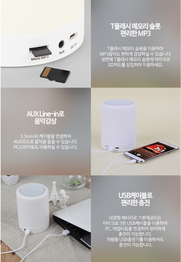알람 기능도 있느니까 거의 완벽한 아이템 이조 그런데 잠잘 때 ASRM 또는 클래식 같은 거 들으시면서 주무시는 분들 많잖아요 요즘 이때 이거 사용하시면 매우 완벽합니다. 블루투스 없을 때는 AUX 케이블로 노래 틀어도 되고 마이크로 USB 나 USB를 사용하셔도 되고 그냥 만들이라고 보시면 돼요 안 되는 게 없을 정도인 거죠. 이 정도면 거의 혁신과 가까운 아이템 이죠.